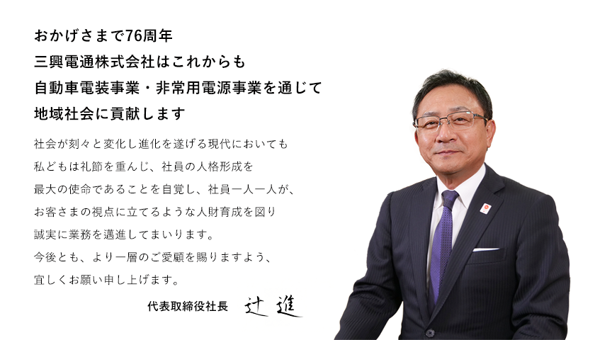 私たち三興電通は、大きく分けて自動車の中枢である電装部品の整備、交換などを中心とした自動車事業部をはじめ、環境に配慮した機器や防災設備の提案・施工業務を中心とした環境システム事業部、社員の管理や事務業務、及び各部品の管理業務を中心とした総務部の3つの部門で構成されています。